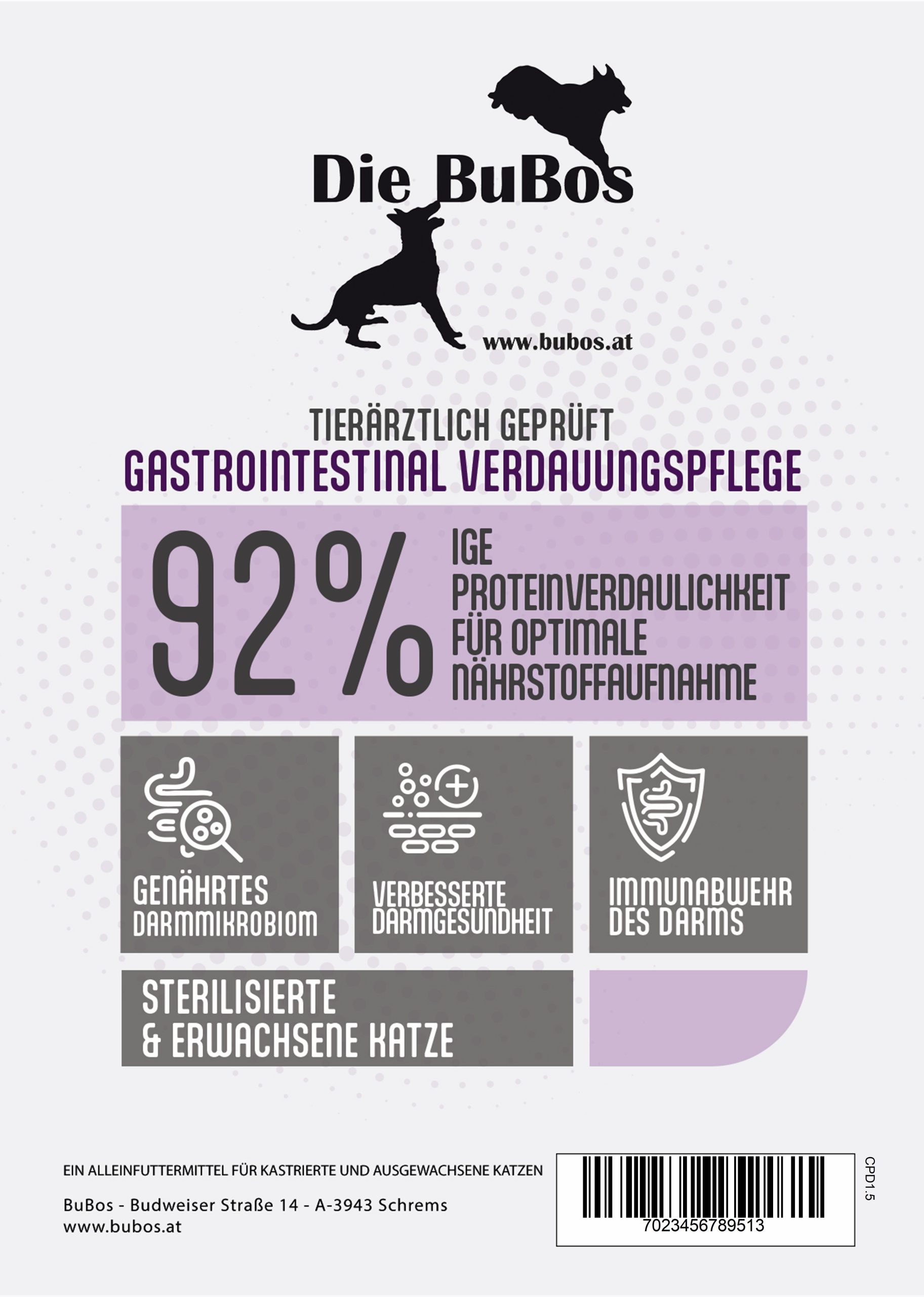 Als obligate Fleischfresser sind Katzen auf eine eiweißreiche Ernährung tierischen Ursprungs angewiesen. Ihr gastrointestinaler Verdauungstrakt ist darauf spezialisiert, Eiweiß effizient zu verdauen und wichtige Nährstoffe wie Taurin und essenzielle Fettsäuren aufzunehmen, die den Energiestoffwechsel, den Erhalt der Muskulatur, das Sehvermögen und die Herzfunktion unterstützen.